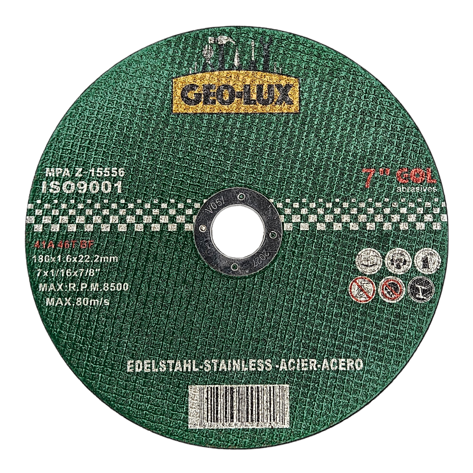 Disc GEO-LUX pentru tăiat metal și oțel, dimensiuni 180 x 1.6 x 22.2 mm. Rezistent și durabil, oferă tăieri precise și rapide cu unelte electrice tip flex, ideal pentru uz profesional sau lucrări de atelier.