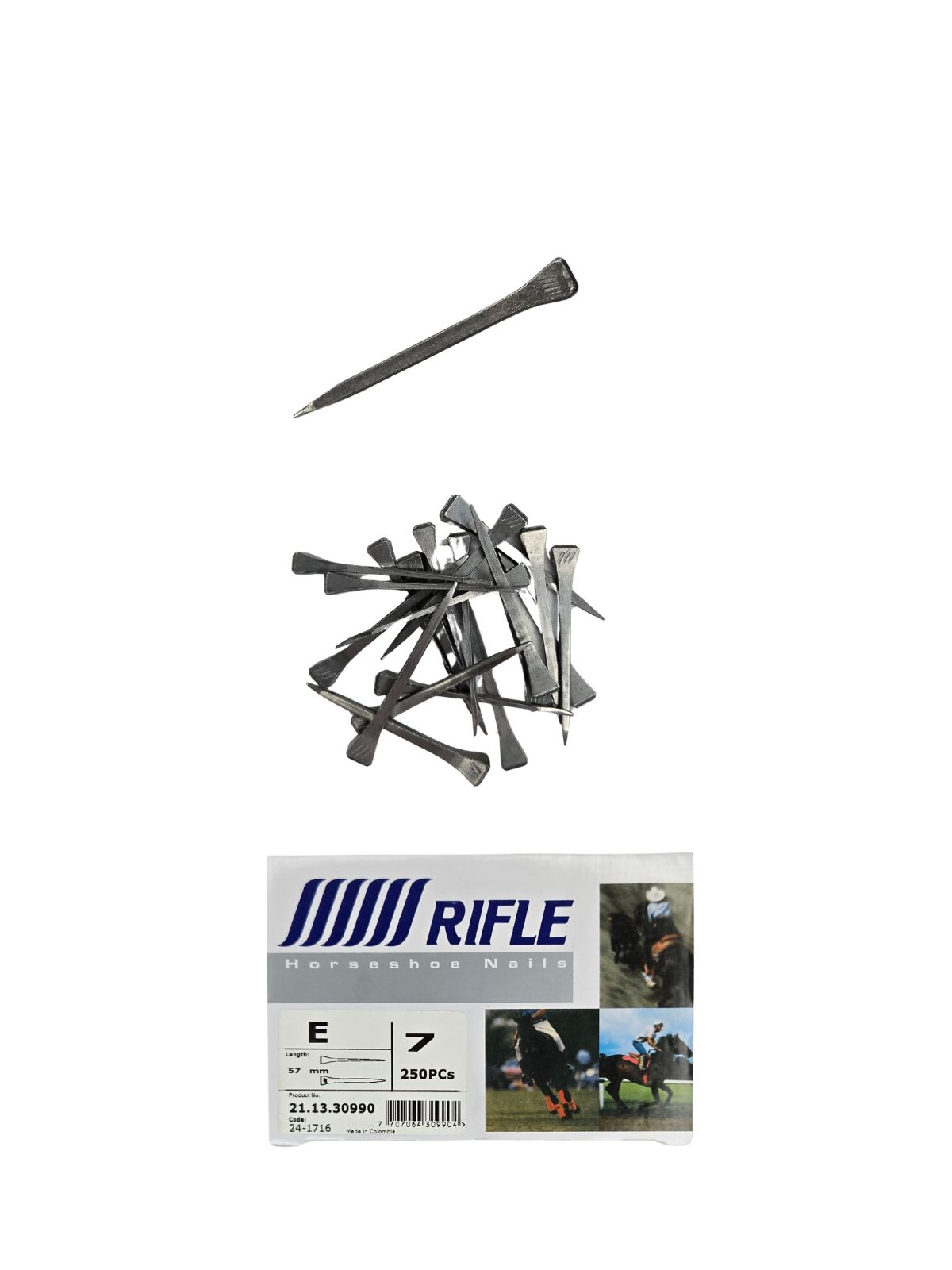 Caiele pentru potcovit Rifle, marimea E7, 57 mm, 250 bucati. Sunt confectionate din otel cu o duritate medie, ce ofera o elasticitate in timpul lucrului. Caielele E reprezinta modelul clasic: un cui de incredere, pentru fiecare centimetru de drum.