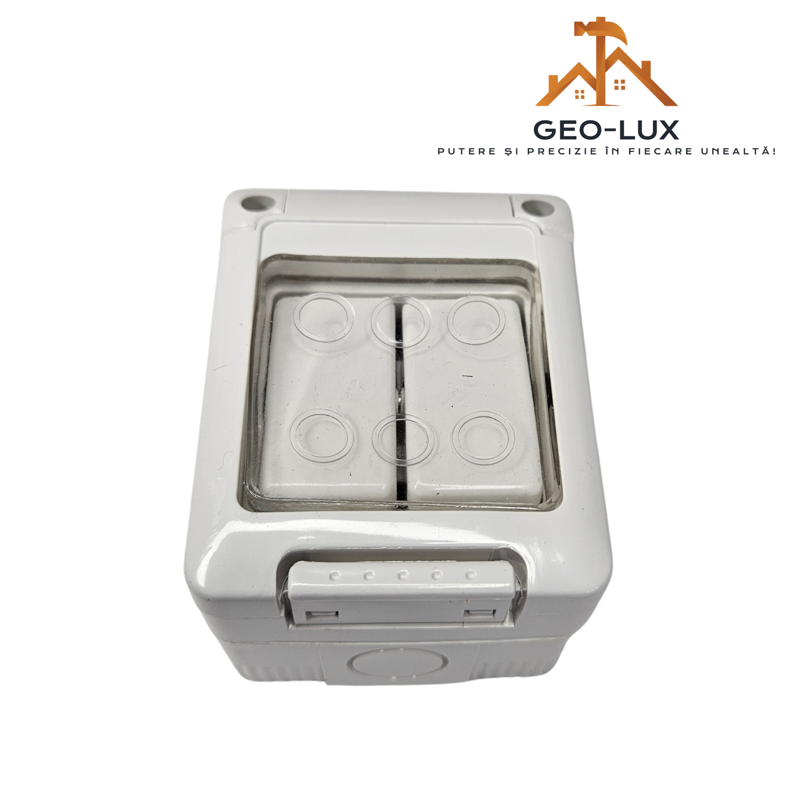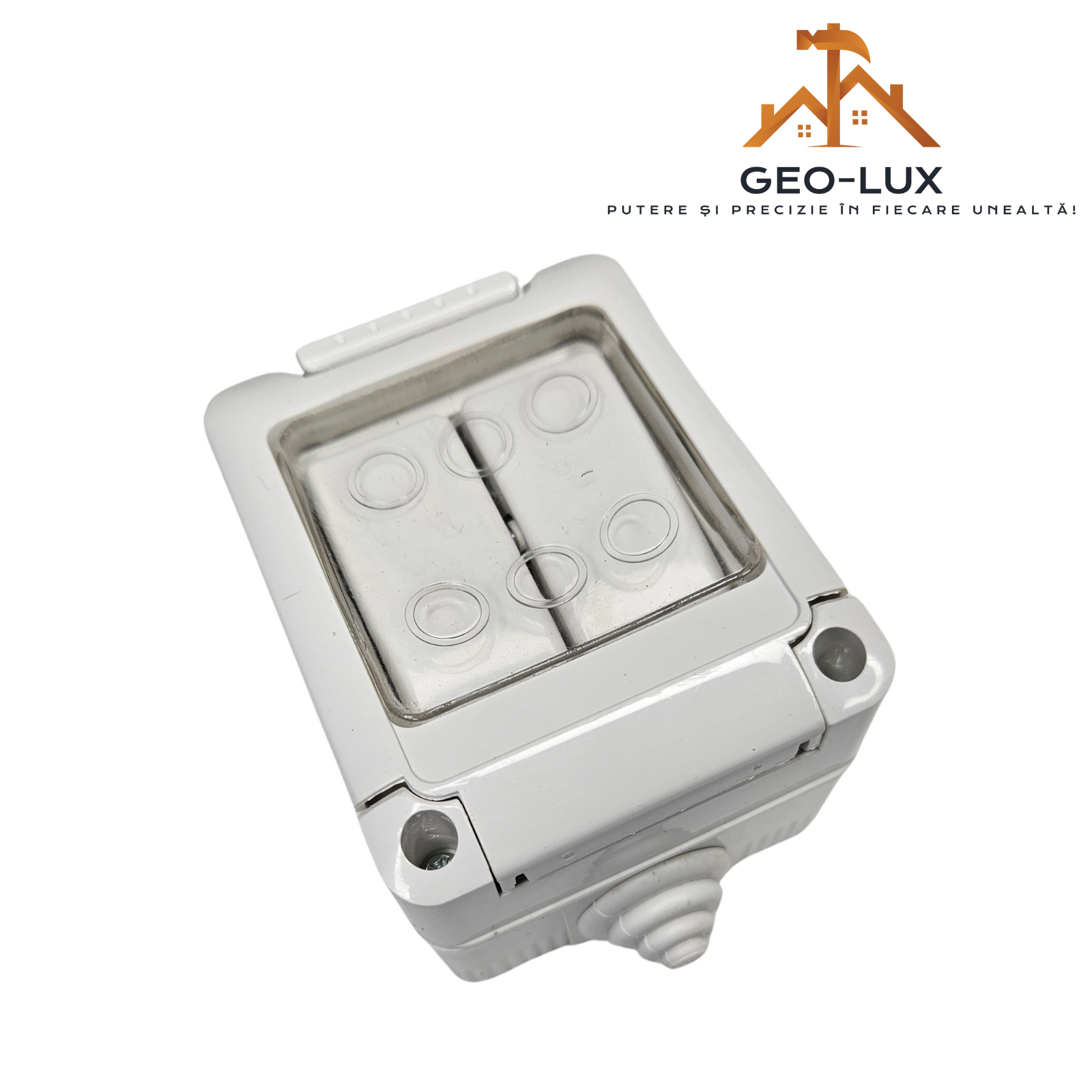 Întrerupător dublu antigron cu protecție, destinat montajului pe tencuială, care asigură control facil și sigur al instalațiilor electrice. Design robust, rezistent la praf și umezeală, ideal pentru utilizare în locuințe sau spații comerciale. Ușor de instalat și durabil în timp.